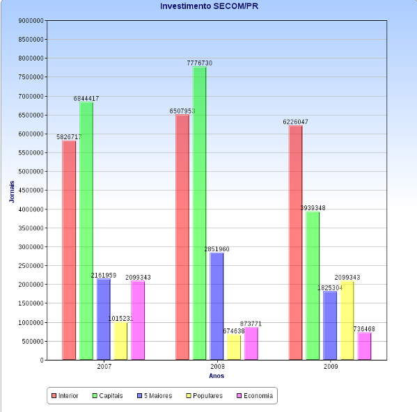 O gráfico mostra o aumento no investimento também para TV e revista. Observando a imagem abaixo, separando somente os números de investimento em jornais, pode-se notar realmente como o governo federal provocou a ira dos grandes veículos impressos. A retirada de verba foi significativa de 2007 até 2009. Enquanto a verba direcionada aos jornais do interior subia, diminuia a verba da capital. Em 2007 os jornalões das capitais receberam 6.844.417,8. Em 2008 a verba subiu um pouco, saltando para 7.776.730,2. Por fim, em 2009, a verba despencou para 3.939.348,0. No mesmo ano, os jornais do interior receberam 6.226.047,5. Veja o gráfico completo.