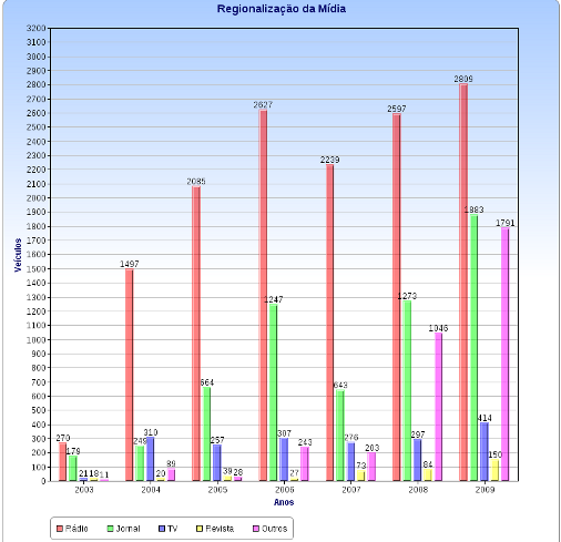 De 2003 até agora o governo Lula começou um processo de regionalização da verba publicitária gerenciada pela Secretaria de Comunicação, a Secom. Ou seja, o dinheiro que antes era destinado somente para os veículos de rádio, TV, jornal e revista das grandes capitais, principalmente São Paulo e Rio, começou a ser redistribuído para veículos do interior do país. É o processo de isonomia, como pediu Mino Carta. Em 2003 o governo federal anunciou em 270 emissoras de rádio. Em 2009 foram 2.809 rádios. Jornais, no mesmo período, saltaram de 179 para 1.883. Veja tabela abaixo. Os dados são da Secom e, portanto, públicos. Basta solicitar, como eu fiz. Clique para ampliar.